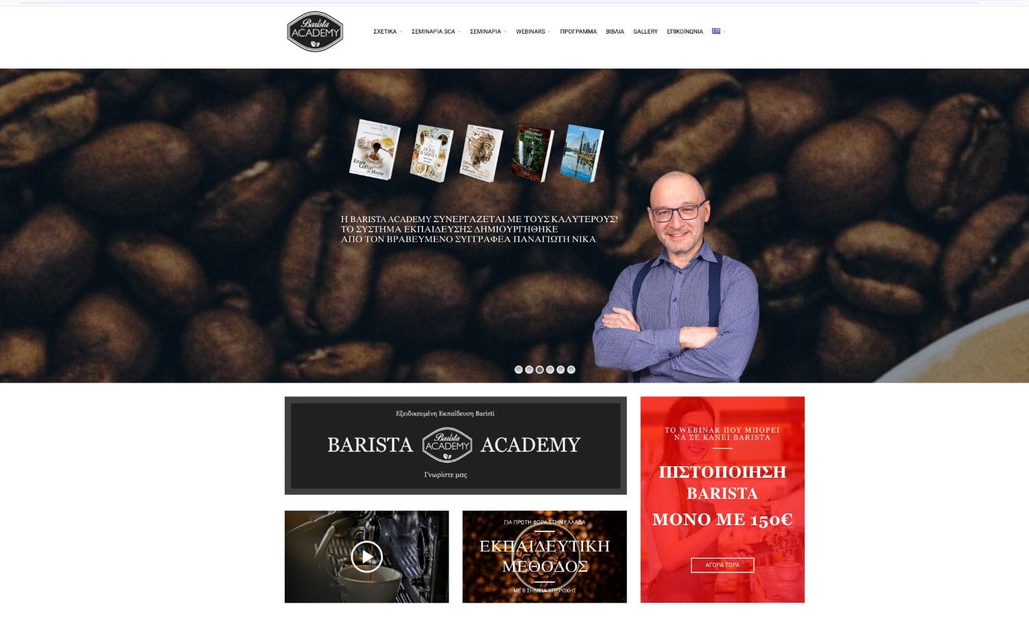 Η αρχική σελίδα παρουσιάζει την εμπειρία Barista: θεατρικά visuals, dynamic sections για σεμινάρια, webinars, πιστοποιήσεις.